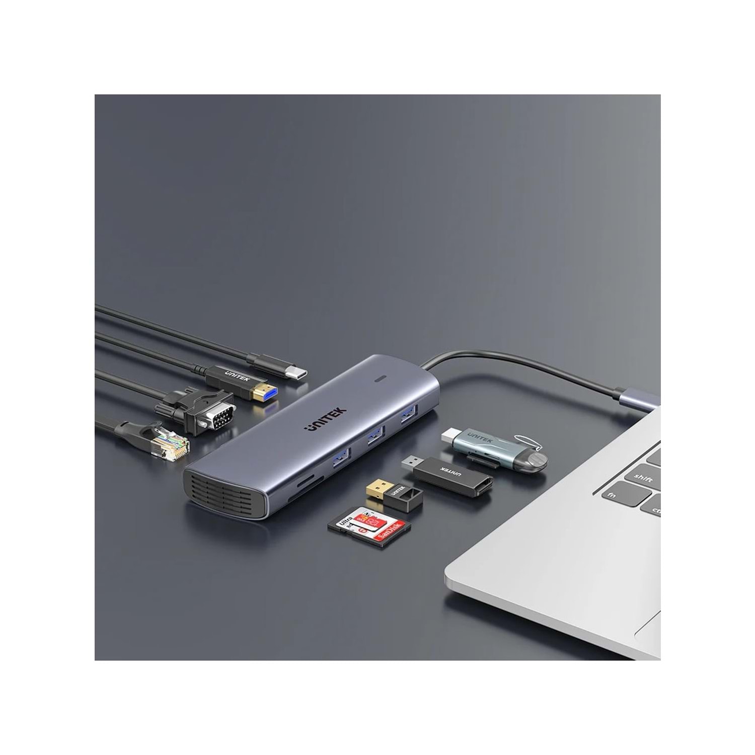 Bu docking istasyonu, tek bir USB-C kablosuyla bilgisayarınıza HDMI (4K), VGA (1080p), üç adet USB 3.0 portu, bir adet USB-C Power Delivery (PD) şarj portu, Gigabit Ethernet (RJ45), SD kart okuyucu ve Micro SD kart okuyucu ekler. Bu zengin port seçimi, tüm çevre birimlerinizi kolayca bağlamanıza olanak tanır.