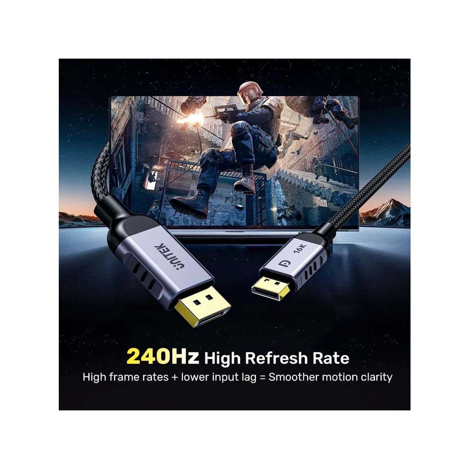 UNITEK DisplayPort 2.1 kablosu, en yüksek çözünürlük ve yenileme hızlarını destekleyerek profesyonel ve üst düzey oyun deneyimi için tasarlanmış bir bağlantı çözümüdür. 16K çözünürlükte 60Hz yenileme hızı ve 4K'da 240Hz gibi olağanüstü performans sunan bu kablo, en yeni monitörler, grafik kartları ve oyun sistemleri için idealdir. %100 bakır çekirdeği ile üstün sinyal kalitesi ve güvenilirlik sağlar.