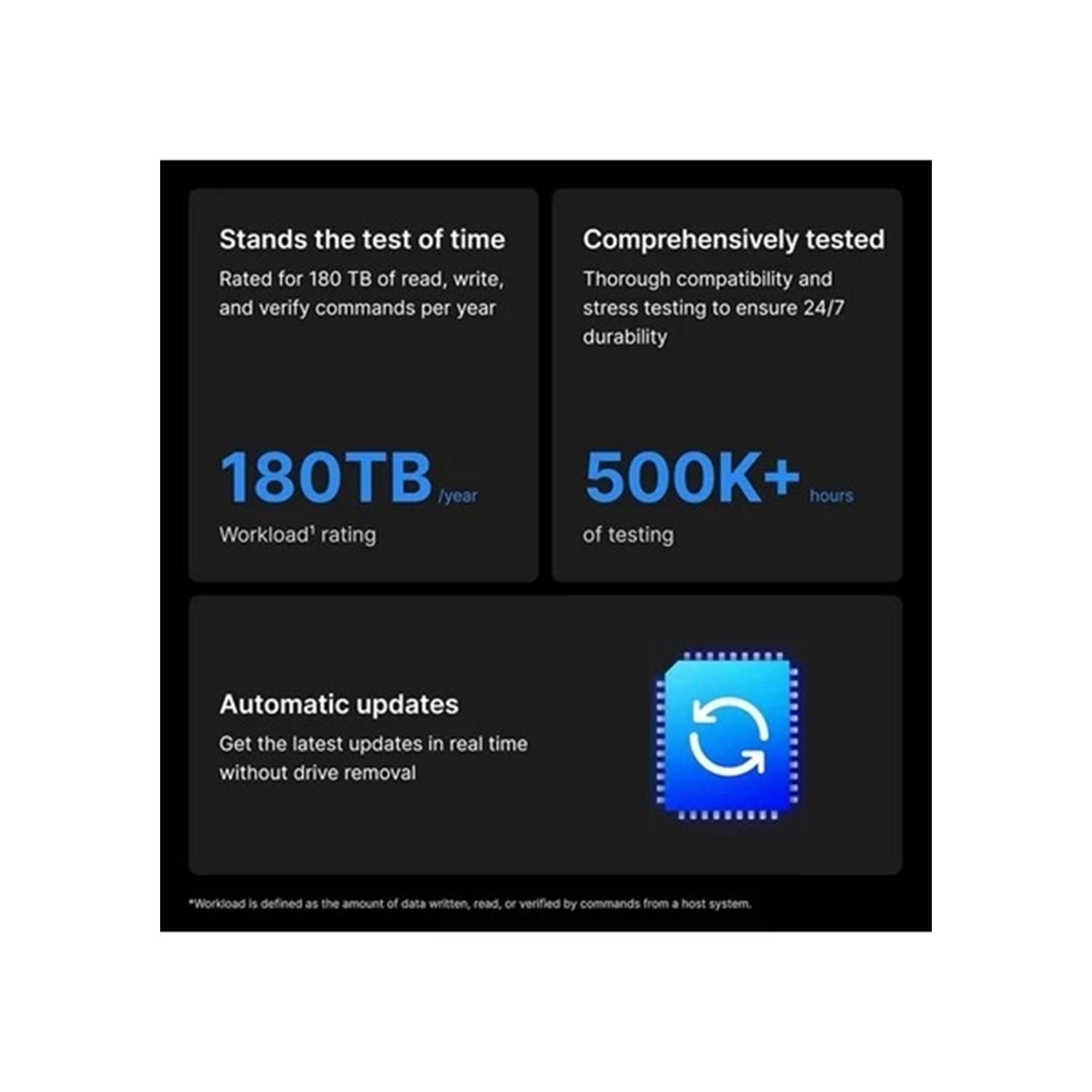 1,2 milyon saat MTBF değeri ve 180 TB/yıl yazma dayanıklılığı ile yoğun iş yükü altında bile güvenilirlik sağlar. Plus Serisi testleriyle 500.000 saat doğrulanmış güvenilirlik sunar :contentReference[oaicite:1]{index=1}.