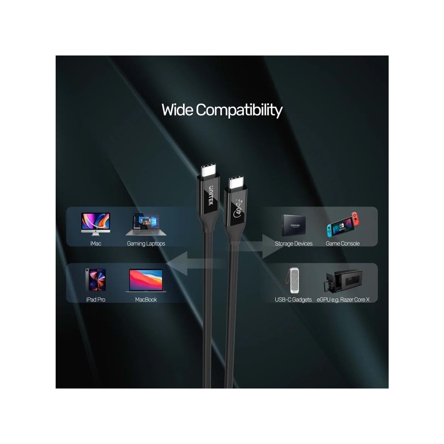 UNITEK USB4 Thunderbolt Kablosu, yüksek veri aktarım hızları ve 100W hızlı şarj desteğiyle profesyonel ve ev kullanıcıları için ideal performans sunar. 8K@60Hz video çıkışı ile ultra yüksek çözünürlükte görüntü aktarımı sağlar.