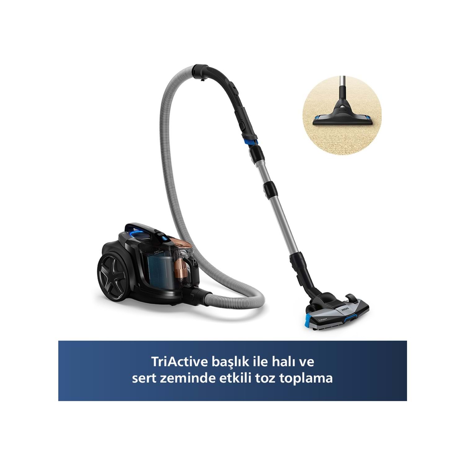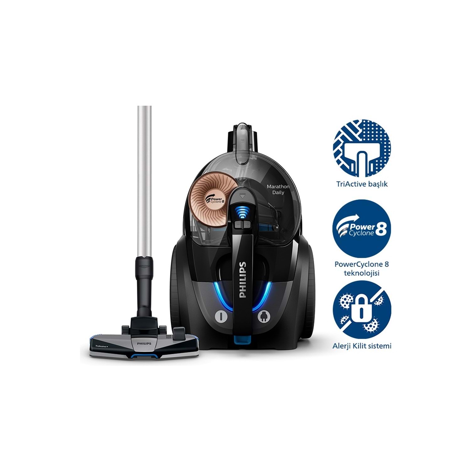 PowerCyclone 8 teknolojisi, yüksek hava akışıyla tozları hızla filtreye taşır. TriActive+ başlık, farklı zemin tiplerinde üstün temizlik sağlar. Allergy H13 filtre, toz ve alerjenlerin %99,9'unu yakalar.