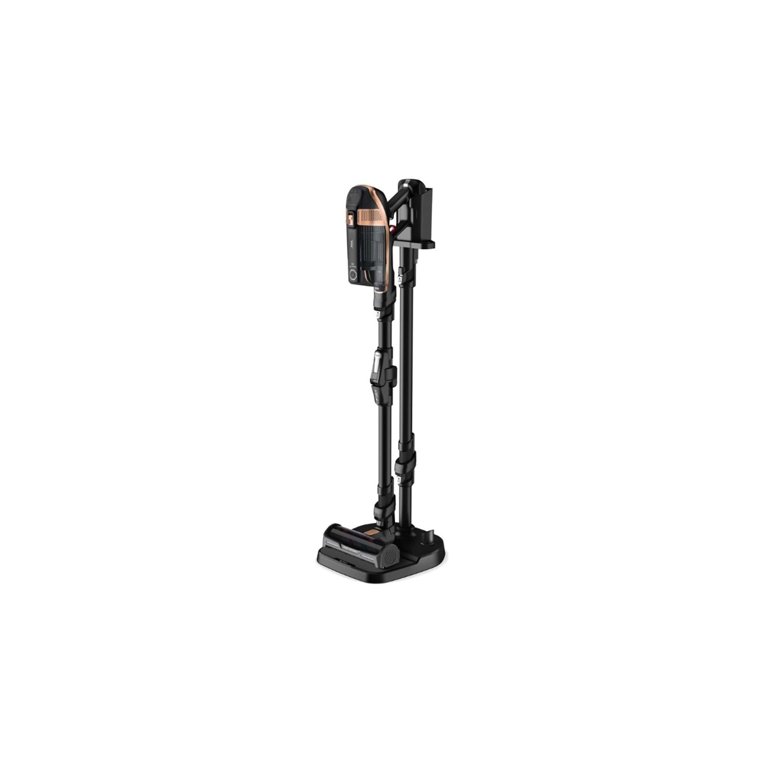 32.4V çıkarılabilir batarya, 3 saatlik hızlı şarjla 1 saat 20 dakika çalışma süresi sağlar. Dijital kontrol ekranı, güç seviyesi ve batarya durumunu gösterir. Ayaklı şarj istasyonu, aksesuarları düzenli tutar ve tavana erişim için uzatma aparatına dönüşür.