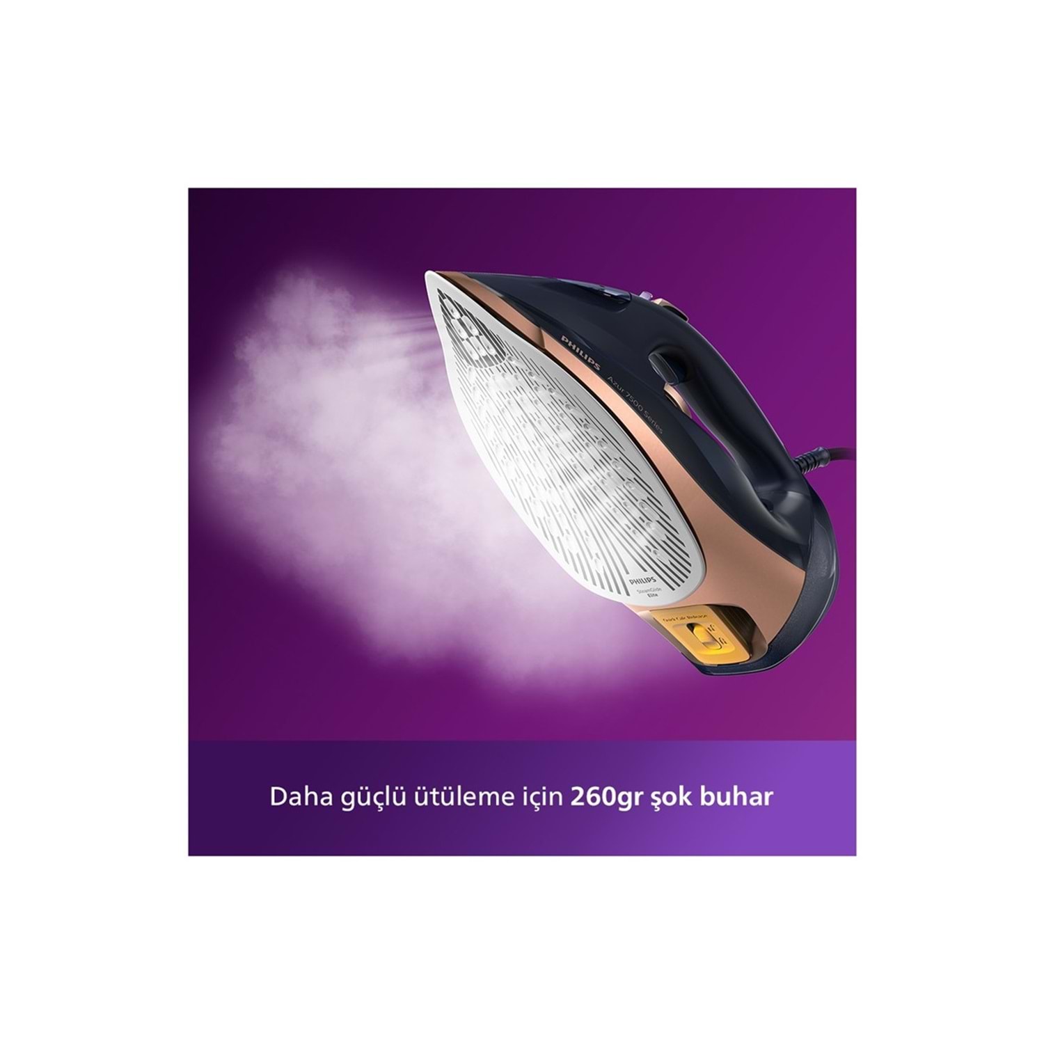 Philips Azur 7500 Serisi DST7510/80 Buharlı Ütü, 3200W gücüyle hızlı ve etkili ütüleme sağlar. Şık mavi-altın tasarımı ve turbo buhar özelliği, en zor kırışıklıkları bile zahmetsizce açar.